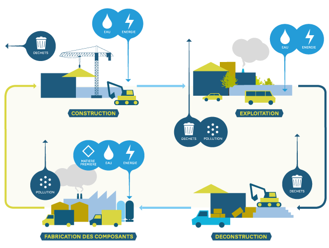 L’impact environnemental d’un bâtiment doit s’établir sur l’ensemble de son cycle de vie, en tenant compte, à chaque étape, des flux entrants (consommations d’eau, de matériaux, d’énergie…) et des flux sortants (déchets, pollution de l’air, de l’eau…).
